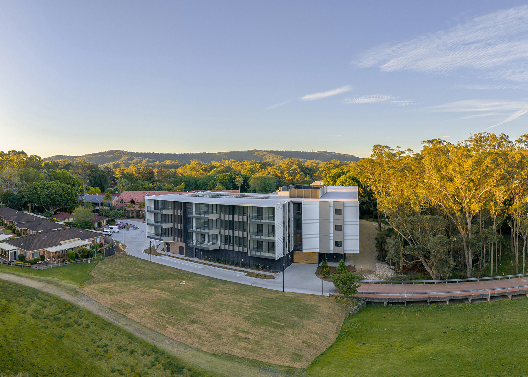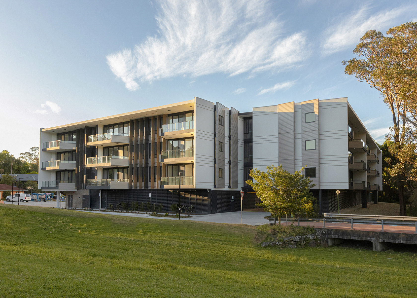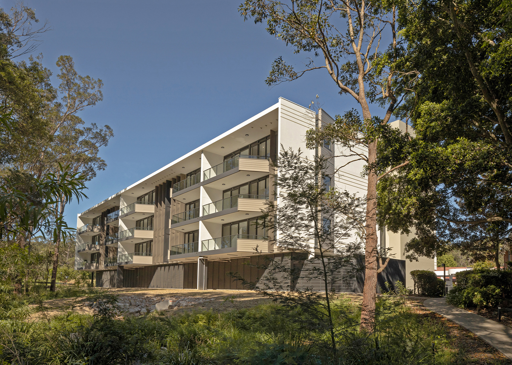 As part of the masterplan expansion the new ILA building will offer existing residents a new option for larger independent apartment style living (compared to the existing low set duplex homes). The 4x storey building houses a limited number of cars on the ground floor, with all new apartments elevated above that take advantage of the surrounding nature reserve, bushland and creek.