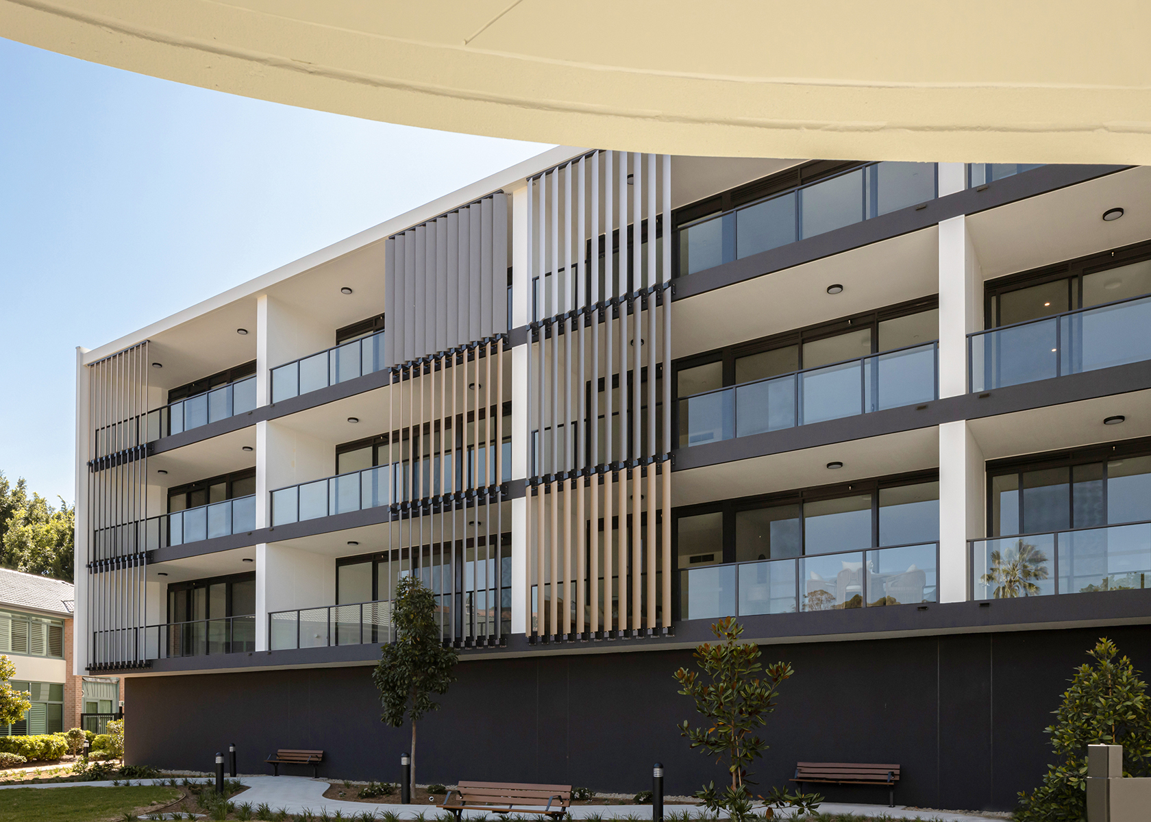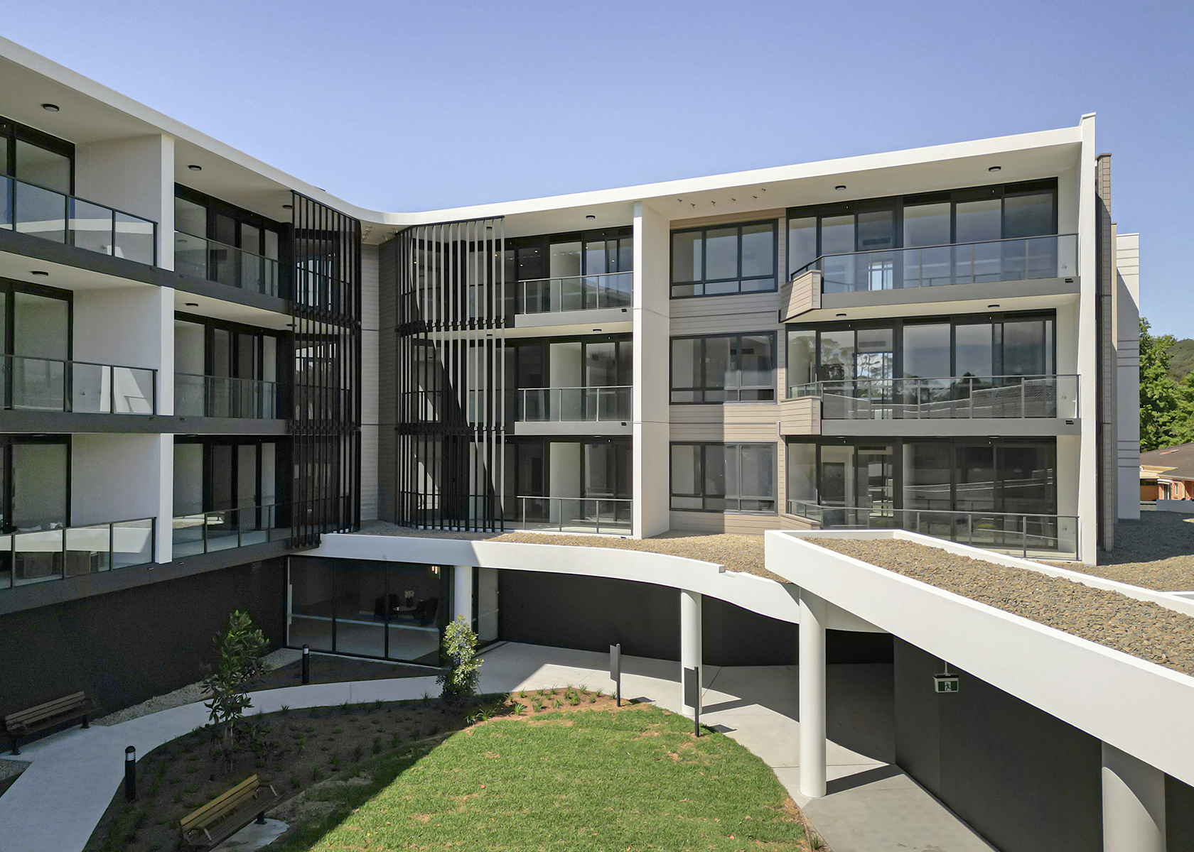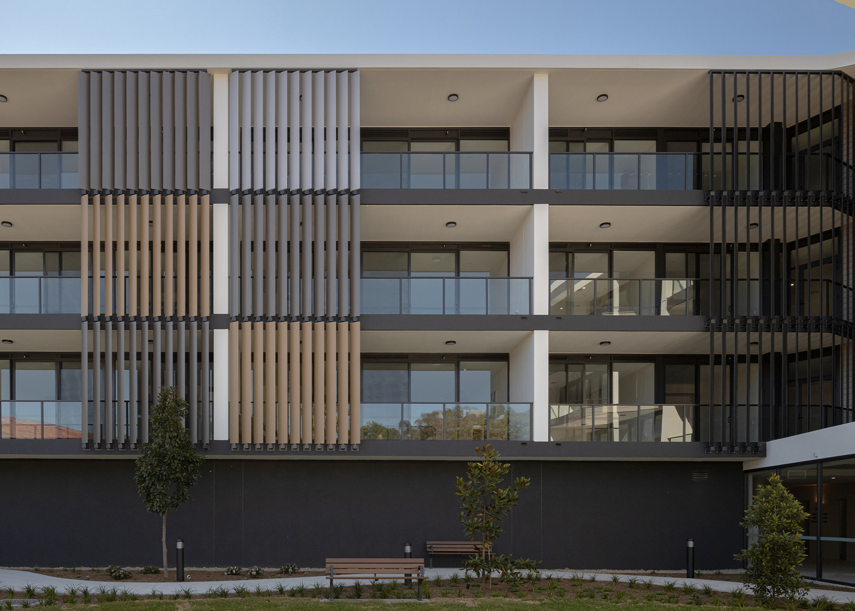 As part of the masterplan expansion the new ILA building will offer existing residents a new option for larger independent apartment style living (compared to the existing low set duplex homes). The 4x storey building houses a limited number of cars on the ground floor, with all new apartments elevated above that take advantage of the surrounding nature reserve, bushland and creek.